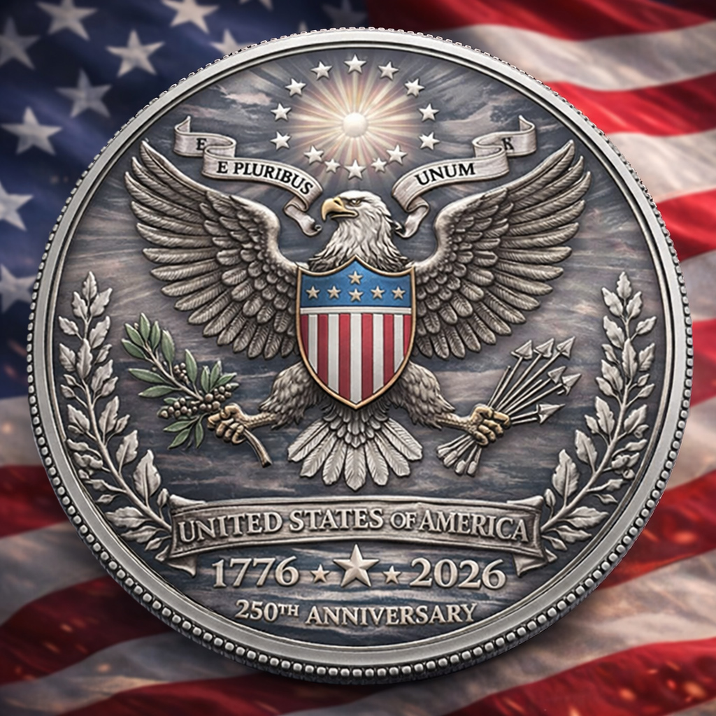 Crafted in deep relief with an antique finish, this commemorative coin stands as a visual and symbolic tribute to 250 years of American history — from revolution to republic.